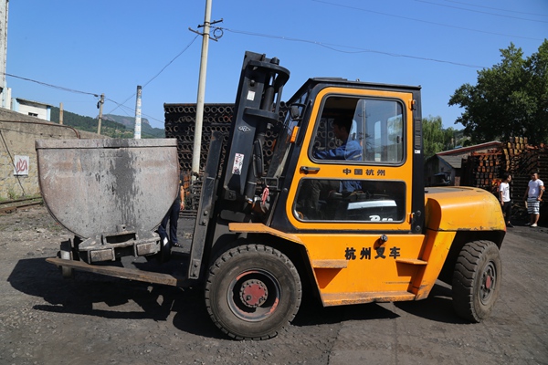叉車司機(jī)頂著戶外高溫和駕駛艙內(nèi)的悶熱,為了保證材料及時入井,正在準(zhǔn)備礦車。