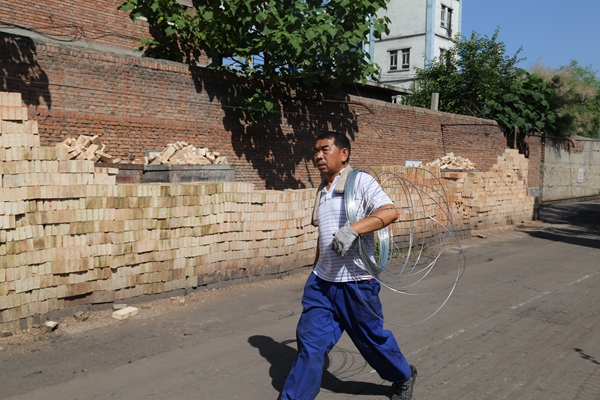 為了保障設(shè)備及時裝車,一名職工不顧高溫炎熱,加緊步伐,肩扛鐵絲,準(zhǔn)備對平板車上的設(shè)備進(jìn)行加固,汗水已濕透全身,他脖子上搭著的一條毛巾,隨時擦汗用。