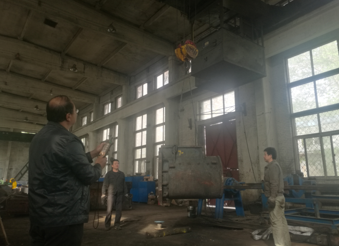 該分公司(廠)組織工程技術(shù)人員密切配合攻難關(guān),集思廣益解難題,精心對車間內(nèi)老舊天車的吊裝操控系統(tǒng)進(jìn)行技術(shù)改造。改造在不破壞設(shè)備原有人工操作系統(tǒng)的基礎(chǔ)上,通過線路連接遙控操作面板與天車操作臺的方法,將天車駕駛室內(nèi)原有電路及遙控器電路與電控柜相聯(lián)通,成功加裝遙控裝置,同時在傳動系統(tǒng)上增加電液推桿制動裝置,按照制動連接桿、軸相互關(guān)聯(lián)的原理,充分利用液壓油缸的最大行程和收回的最短距離,由電液推桿連接制動連桿,最終將集成信號傳導(dǎo)為操作指令實現(xiàn)遙控作業(yè)。