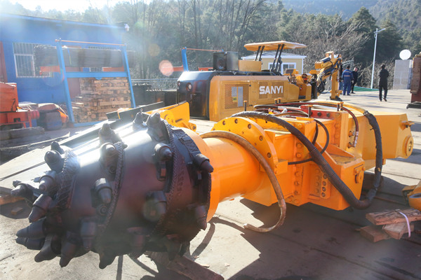 該礦引進的YBUS-230/6懸臂式掘進機,體長10.44米,高度1.72米,重65噸,截割面積25平方米,主要由截割機構(gòu)、裝載機構(gòu)、運輸機構(gòu)、機架及回轉(zhuǎn)臺、行走機構(gòu)、液壓系統(tǒng)、電氣系統(tǒng)、冷卻滅塵系統(tǒng)及機器的操作控制與保護等九大部分組成。該設(shè)備機身小巧在巷道內(nèi)具有靈活性,可實現(xiàn)連續(xù)開挖,尤其在井下煤巷中能夠截割巷道全斷面,不僅速度快還效率高,該設(shè)備工作中通過炮頭截割將煤從煤體中分離后,經(jīng)刮板輸送機和膠帶輸送機完成裝載運輸工作。