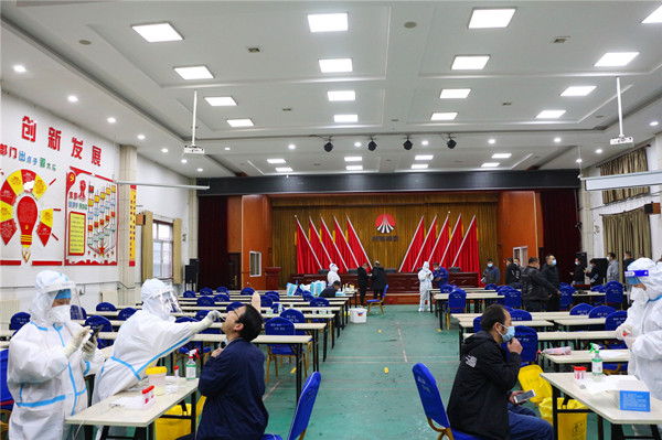 同時,青年志愿者宣傳引導職工正確、快速填寫預約碼登記信息,快速配合采樣檢測。保衛(wèi)部門維護秩序,防止檢測前后人員聚集?;鶎訂挝话凑諜z測工作要求,錯時分批組織職工前往檢測點。10余名醫(yī)務人員共設立3個采樣臺,對前來采樣的職工分流依次檢測,醫(yī)務人員嫻熟、嚴謹?shù)闹貜椭∈米?、采樣、裝試管等一系列動作,快速高效完成核酸檢測工作。
