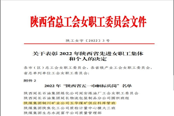 近日,陜西省總工會(huì)女職工委員會(huì)公布了省先進(jìn)女職工集體和個(gè)人評(píng)選結(jié)果,玉華煤礦供應(yīng)科庫(kù)管班榮獲了陜西省“五一巾幗標(biāo)兵崗”榮譽(yù)稱號(hào)。到底是何等颯爽英姿的巾幗班組,能夠從全省評(píng)比中脫穎,讓我們一起來(lái)了解她們的故事。