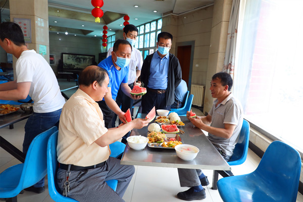 豆角炒肉、小蔥拌豆腐、土豆燉排骨、宮保雞丁、蔥油三絲、燒茄子、蒸碗……,礦井精心烹制的端午節(jié)美食,一上桌就讓人齒頰生香,再搭配一塊解暑西瓜,來一份香甜又應(yīng)景的甑糕,職工食堂里的干部職工因此幸福感爆棚。