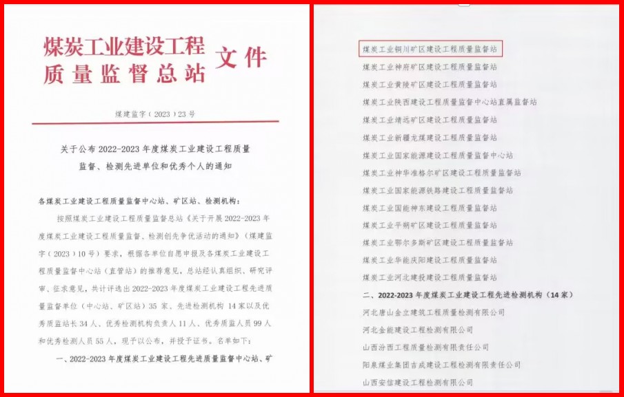 近日,煤炭工業(yè)銅川礦區(qū)建設(shè)工程質(zhì)量監(jiān)督站在全國2022—2023年度煤炭工業(yè)建設(shè)工程質(zhì)量監(jiān)督、檢測“創(chuàng)先爭優(yōu)”活動中喜獲佳績,榮獲全國煤炭工業(yè)建設(shè)工程先進質(zhì)量監(jiān)督礦區(qū)站榮譽,同時銅川礦區(qū)站站長艾龍龍同志榮獲優(yōu)秀站長榮譽、銅川礦區(qū)站解宇哲同志榮獲優(yōu)秀質(zhì)量監(jiān)督專業(yè)人員榮譽。