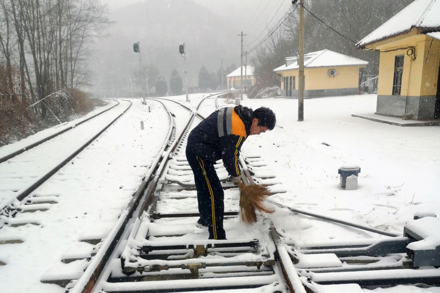 “陳家山車站線路已積聚冰塊積雪,為不影響行車安全,請迅速除冰掃雪”。8時20分,北區(qū)段值班室響起了急促的電話聲。負(fù)責(zé)人帶領(lǐng)職工拿著除雪鏟、掃把等除雪設(shè)備頂著漫天大雪,根據(jù)道岔分布情況,兵分兩路對站內(nèi)道岔進(jìn)行除雪工作。與此同時,機(jī)車維修中心、工電段干部職工相繼出動,一時間,各個段站在各自管轄區(qū)域,開展除冰掃雪作業(yè),成功打通安全通道。