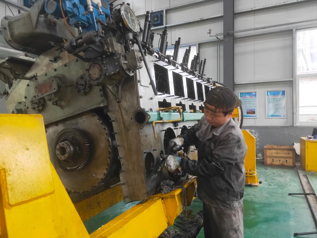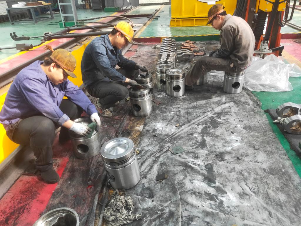 進(jìn)入檢修車間,到處都是青年檢修工忙碌的身影,順著“叮叮當(dāng)當(dāng)”的敲擊聲望去,映入眼簾的是一個(gè)火車頭,它穩(wěn)穩(wěn)的停在車間的軌道上,只見檢修工們正認(rèn)真的對(duì)車上的各個(gè)部件進(jìn)行全面的檢查,發(fā)現(xiàn)問題及時(shí)記錄并拆解。他們有的鉆到車體底部拆電線、放油,有的爬上車頂配合天車起吊頂蓋、側(cè)墻,有的鉆進(jìn)柴油機(jī)間拆水管、燃油管、機(jī)油管……檢修工人的每一個(gè)動(dòng)作都有條不紊,每一次起吊都小心翼翼。只見他們一手拿著扳手,一手拿著鉗子,時(shí)而鉆入、鉆出,時(shí)而攀上爬下,時(shí)而又下蹲,忙碌地在機(jī)車上精檢細(xì)修,只要是跑冒滴漏都逃不出他們的眼睛。