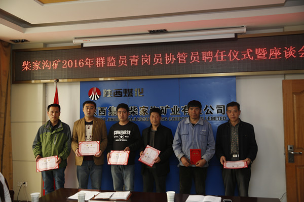 近日,柴家溝礦召開2016年度群監(jiān)員青崗員協(xié)管員聘任儀式暨座談會(huì),為新聘任的群監(jiān)員、青崗員、家屬協(xié)管員頒發(fā)了聘書,分析目前開展群安工作存在的問題,部署研究下階段群安工作。該礦群監(jiān)員、青崗員及家屬協(xié)管員代表,各車間工會(huì)主席及安全監(jiān)察部、經(jīng)營(yíng)辦、工會(huì)等相關(guān)部門負(fù)責(zé)人參加會(huì)議。