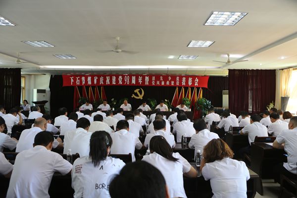 該礦黨委書記李國璧作了題為《圍繞中心抓黨建黨建領(lǐng)航促發(fā)展為建設(shè)安全穩(wěn)定和諧美麗新礦區(qū)提供堅強(qiáng)保證》的工作報告。簡要回顧了中國共產(chǎn)黨98年艱苦奮斗的光輝歷程,從提升黨建、黨風(fēng)廉政建設(shè)工作水平、強(qiáng)化安全管理工作、強(qiáng)化和諧穩(wěn)定局面、強(qiáng)化企業(yè)文化建設(shè)、強(qiáng)化群團(tuán)工作服務(wù)水平“四個強(qiáng)化”方面和注重環(huán)境治理、注重干部隊伍建設(shè)“兩個注重”方面總結(jié)回顧了一年來全礦創(chuàng)先爭優(yōu)、黨建工作取得的階段性成果,指出了存在問題。就做好今后一個時期工作任務(wù)提出了八點(diǎn)要求。一是認(rèn)真落實十九大精神,大力實施“黨建領(lǐng)航”戰(zhàn)略;二是夯實黨組織建設(shè),提升黨建工作科學(xué)化水平;三是強(qiáng)化安全管理,繼續(xù)實現(xiàn)安全“零”目標(biāo);四是維護(hù)礦區(qū)穩(wěn)定,繼續(xù)實現(xiàn)穩(wěn)定“零”目標(biāo);五是認(rèn)真履行環(huán)保職責(zé),持續(xù)改善礦區(qū)環(huán)境面貌;六是深化黨風(fēng)廉政建設(shè),扎實推動工作落實;七是推進(jìn)文化強(qiáng)企戰(zhàn)略,提升企業(yè)文化水平;八是發(fā)揮群團(tuán)組織紐帶作用,推動各項工作發(fā)展,以優(yōu)異成績向中華人民共和國成立70周年獻(xiàn)禮。