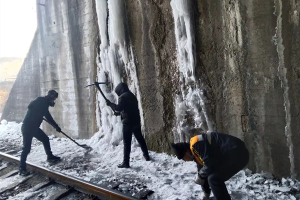 近日,柴家溝井儲煤場黨支部組織黨員化身打冰人,清理煤臺鐵路煤炭運輸窯洞段隧道內(nèi)的冰柱,為鐵路運輸保駕護航。