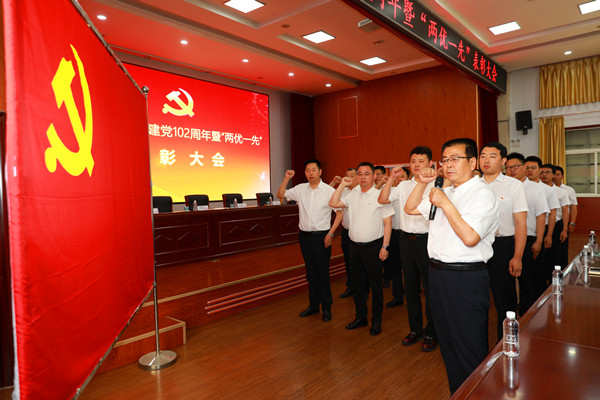 6月30日,玉華礦召開慶祝中國共產黨成立102周年暨“兩優(yōu)一先”表彰會。傳達了公司慶祝建黨102周年暨“兩優(yōu)一先”表彰會精神,宣讀了礦井《關于表彰2022年度“兩優(yōu)一先”活動先進集體和先進個人的決定》,納新黨員進行入黨宣誓。礦領導班子成員和機關科室、基層單位負責人,納新黨員和受表彰的先進集體和先進個人參加會議。