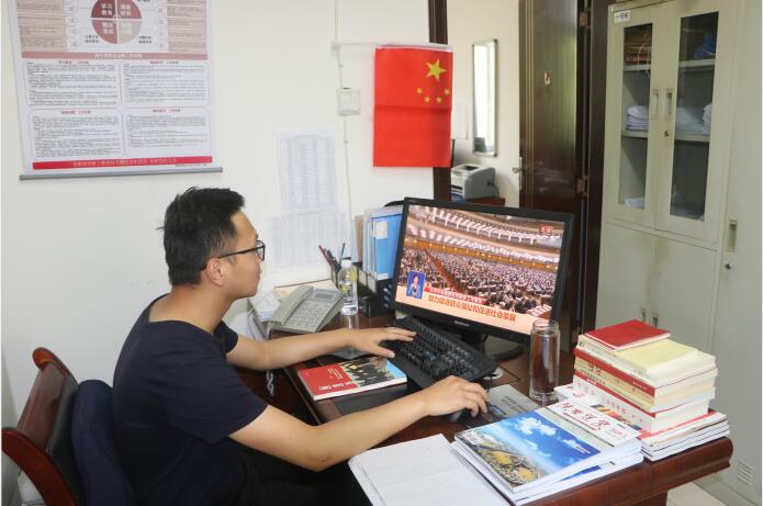 在項目部綜掘一隊值班室,該隊干部職工圍坐一圈正在通過電視認真觀看“兩會”直播盛況,大家緊盯屏幕,聚精會神聽報告,了解與自己息息相關(guān)的民生政策。在項目部主井大帶操作車間,職工們通過手機視頻軟件密切關(guān)注“兩會”動態(tài),熱議“兩會”釋放的新政策。在機關(guān)各部室辦公室,大家利用工作間隙邊聽邊學(xué),在筆記本上記下“兩會”要點。與此同時,項目部黨群部通過QQ群、微信群,及時轉(zhuǎn)發(fā)“兩會”熱點,廣大干部職工也在通過“學(xué)習(xí)強國”學(xué)習(xí)平臺密切關(guān)注“兩會”動態(tài),在項目部迅速掀起了“學(xué)習(xí)、討論、宣傳”“兩會”精神的熱潮。