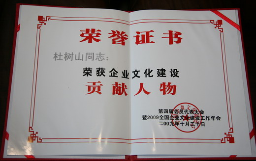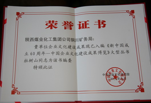 全國(guó)企業(yè)文化的盛會(huì)——“2009年全國(guó)企業(yè)文化建設(shè)工作年會(huì)暨第四屆會(huì)員代表大會(huì)”,10月29日至10月31日在山西太原召開,我局當(dāng)選為理事單位,杜樹山書記當(dāng)選為理事,礦務(wù)局被樹為全國(guó)企業(yè)文化建設(shè)“百佳”貢獻(xiàn)單位,局黨委書記杜樹山被評(píng)為“全國(guó)企業(yè)文化建設(shè)貢獻(xiàn)人物”,由杜書記任編委的《新中國(guó)成立60周年——中國(guó)企業(yè)文化建設(shè)成果博覽》大型叢書出版發(fā)行,銅川局企業(yè)文化建設(shè)成果入編此書。