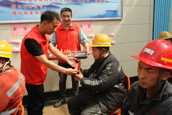 為了豐富職工文化生活,保障職工全身心投入到安全生產(chǎn)工作中,確保安全生產(chǎn)月活動取得實效。6月14日下午,陳家山礦在井口人車場組織開展了“心手相牽 共享安全”志愿服務活動,向高溫天氣堅守在一線的職工送去清涼關懷與關愛。