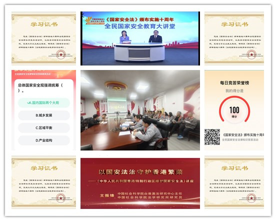 為深入學(xué)習(xí)領(lǐng)會(huì)習(xí)近平法治思想的重大意義、豐富內(nèi)涵、精神實(shí)質(zhì)和實(shí)踐要求,大力學(xué)習(xí)宣傳總體國(guó)家安全觀,該中心明確學(xué)習(xí)內(nèi)容,緊扣“全民國(guó)家安全教育 走深走實(shí)十周年”主題,圍繞總體國(guó)家安全觀有關(guān)內(nèi)容,以觀看講座、線上答題和朗讀相結(jié)合,引導(dǎo)廣大職工通過(guò)掃描活動(dòng)二維碼,直接進(jìn)入答題環(huán)節(jié)參與只是競(jìng)答和朗讀活動(dòng),堅(jiān)持每日觀看一個(gè)講座片段、答一份競(jìng)賽試題,堅(jiān)持每日朗讀一個(gè)法條段落。全體參與活動(dòng)人員均獲得《2025年全民國(guó)家安全教育學(xué)習(xí)證書》。