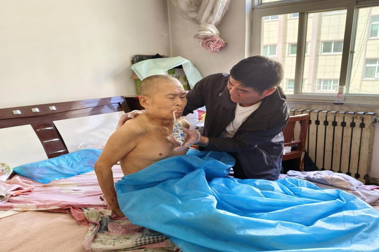 在這場愛心接力中,該中心運(yùn)行部長劉小兵以真摯的情感和實(shí)際行動(dòng)成為最溫暖的“接力者”。他毫不猶豫地主動(dòng)承擔(dān)起照料重任,每天早早到李銀虎家中,為他洗漱、擦拭身體,準(zhǔn)備營養(yǎng)早餐并耐心喂食;每隔一段時(shí)間為他翻身、按摩,預(yù)防臥床并發(fā)癥;工作間隙匆匆趕去陪他聊天讀報(bào),用歡聲笑語驅(qū)散孤獨(dú);夜晚安頓他休息后才離開。劉小兵的每一步都飽含溫情,每一個(gè)細(xì)節(jié)都彰顯初心。