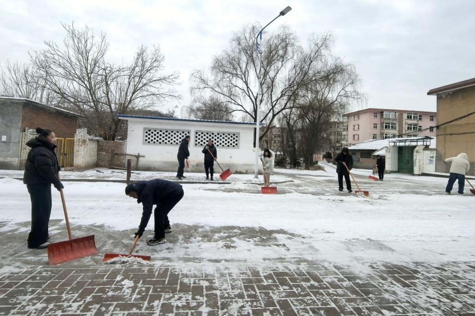 除雪小組的工作人員手持鐵鍬、推雪板、掃帚等工具,冒著凜冽寒風(fēng)開始作業(yè),有的揮舞鐵鍬破冰鏟雪,有的推著推雪板清理積雪,有的用掃帚細(xì)致清掃殘余冰雪,分工協(xié)作、有條不紊。冰冷的雪花落在臉上、鉆進(jìn)衣領(lǐng),浸濕了衣物,但大家絲毫沒有退縮,干勁十足,現(xiàn)場一派熱火朝天的勞動景象。經(jīng)過全體工作人員三小時(shí)的連續(xù)奮戰(zhàn),小區(qū)內(nèi)各主干道、出入口及重點(diǎn)區(qū)域的積雪已全部清理完畢,道路恢復(fù)暢通,確保了居民正常出行不受影響。