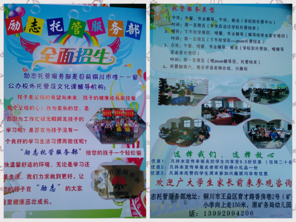 新春已過,開學(xué)在即,孩子們的課外文化課輔導(dǎo)和安全學(xué)習(xí)環(huán)境又成了家長的糾結(jié)和牽心的事情,銅川實(shí)業(yè)機(jī)關(guān)分公司勵(lì)志托管服務(wù)部緊抓有利時(shí)機(jī),廣泛動員宣傳,提早做好前期招生各項(xiàng)準(zhǔn)備工作,進(jìn)一步擴(kuò)大勵(lì)志托管服務(wù)部的知名度和社會影響力。