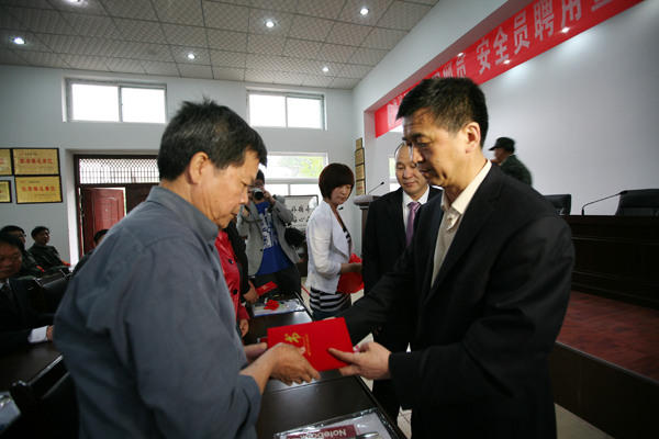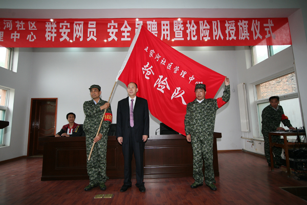 授旗儀式上,王家河社區(qū)管理中心主任張學(xué)海親自為搶險(xiǎn)隊(duì)授旗。搶險(xiǎn)隊(duì)政委接過鮮紅的隊(duì)旗并做了表態(tài)發(fā)言。同時,為一號井、礦部、斜井三個地區(qū)的李金峰等10名同志頒發(fā)了“安全工作義務(wù)管理員”聘書和鮮紅的治安巡邏袖章;為社區(qū)工作人員孫恒奇等5名工作人員頒發(fā)了“安全員”聘書。并制定了《安全員、群安員崗位責(zé)任制度》、《安全員、群安員工作職責(zé)》。通過此舉措,調(diào)動更多的轄區(qū)職工群眾積極參與到群防群治工作,不斷增強(qiáng)轄區(qū)職工群眾的安全意識,營造良好的社會治安秩序。