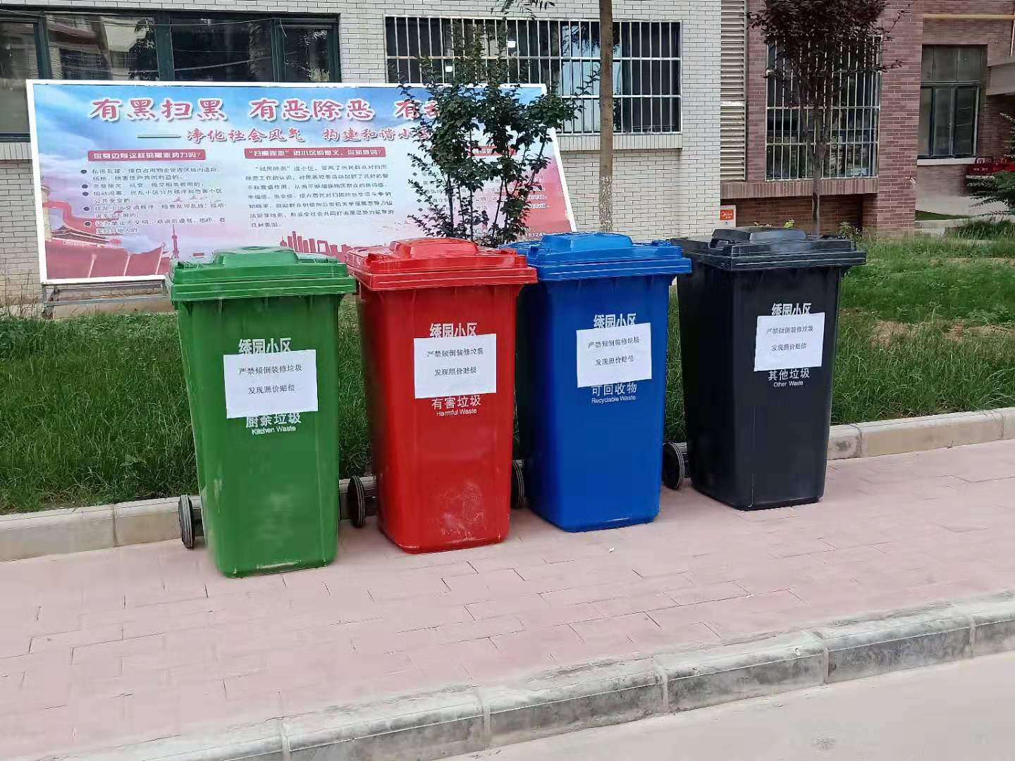 近日,華遠(yuǎn)項(xiàng)目部繡園社管中心本著服務(wù)住戶,方便住戶的原則,在華遠(yuǎn)項(xiàng)目部的大力支持下,為轄區(qū)配置生活垃圾桶,并采用目前銅川市比較先進(jìn)的垃圾分類設(shè)置,為四色垃圾桶分類設(shè)置,綠色(廚余垃圾),藍(lán)色(可回收垃圾),紅色(有害垃圾)?;疑ㄆ渌?,全覆蓋安置在轄區(qū)各樓前,極大地方便住戶生活垃圾分類丟放。