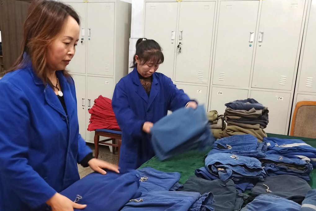 洗滌、脫水、烘干、縫補(bǔ)、折疊、上架,這是洗衣房女工每天的工作步驟。這些工作看似簡(jiǎn)單,想要做好卻不容易。從洗滌后折疊衣服這一項(xiàng)來(lái)說(shuō),通常一個(gè)人一站就是幾個(gè)小時(shí),待上百套衣服檢查完,女工的手指都會(huì)發(fā)麻。工作服洗的次數(shù)多了,就會(huì)容易破損,每件工作服烘干以后,她們還要挨個(gè)檢查,將掉扣子的和破損的工作服挑出來(lái),再一件件釘好、縫好,盡管沒(méi)有專門的縫補(bǔ)工,但她們個(gè)個(gè)都練成了縫補(bǔ)能手。