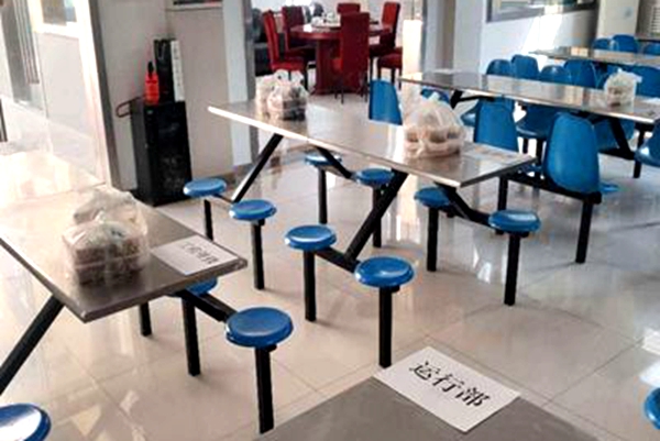 為解決復(fù)工后職工就餐這一關(guān)系職工切身利益的問題,該項(xiàng)目部特成立職工餐廳內(nèi)部疫情防控領(lǐng)導(dǎo)小組。要求所有餐廳工作人員每日進(jìn)入崗位前測量體溫進(jìn)行登記并佩戴防護(hù)工具。同時(shí),實(shí)行分餐制度,各部門指定專人取餐,避免了人群聚集、減少交叉感染的同時(shí),又極大地方便了職工,保障了復(fù)工復(fù)產(chǎn)有序推進(jìn)。