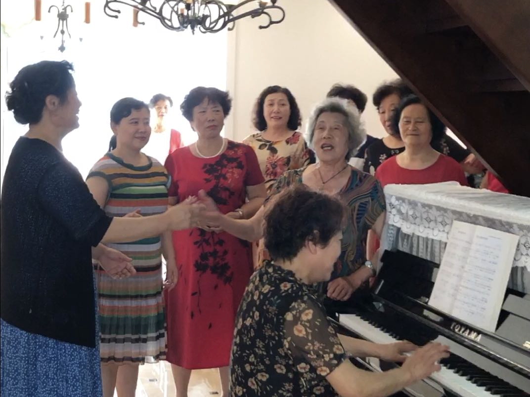 一聲低沉的男聲響起“七月南湖水漣漣……”“南湖的船,黨的搖籃”女聲伴唱齊聲響起,眼前仿佛看到中國(guó)共產(chǎn)黨成立之初的艱辛,革命勝利來(lái)之得不易,大家眼含淚花,熱血沸騰。最后一曲《媽媽教我一支歌》,是她們專門排練的曲目。田老太太80多歲了,這些醫(yī)院退休人員都是曾經(jīng)的同事,也是親如一家的人,她們將老太太當(dāng)作母親,發(fā)自內(nèi)心的抒發(fā)對(duì)黨的無(wú)限熱愛(ài)之情。老太太大女兒的兩個(gè)閨蜜,也恰巧來(lái)家里看望,一同加入了合唱的行列。