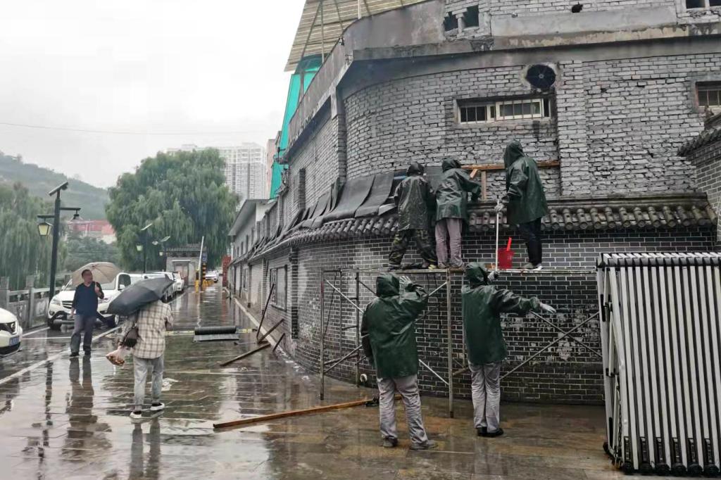 該中心在例行安全檢查、巡查過(guò)程中,監(jiān)管安全管理人員匯報(bào),發(fā)現(xiàn)職工食堂外墻出現(xiàn)明顯安全隱患,墻基已經(jīng)出現(xiàn)松散、剝落現(xiàn)象。險(xiǎn)情就是命令,安全就是責(zé)任。該公司立即召開(kāi)由工程部相關(guān)人員參加的現(xiàn)場(chǎng)專(zhuān)題會(huì)議,及時(shí)制定防御措施和隱患排除方案。工程部全體黨員干部穿上雨衣、搭好架子、準(zhǔn)備好防御材料,說(shuō)干就干,大家齊心協(xié)力,分工明確,及時(shí)對(duì)墻體夾縫雜物清理、對(duì)積水進(jìn)行排除,為確保不滲水,臨時(shí)搭建防御材料,對(duì)裂縫部位采取回填、灌縫,防水材料澆筑,確保隱患不擴(kuò)散,安全有保障,為后期重新修復(fù)夯實(shí)基礎(chǔ)。