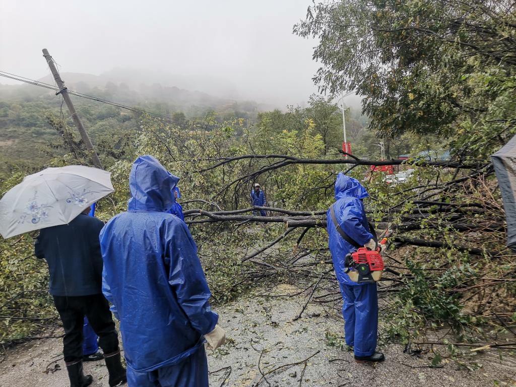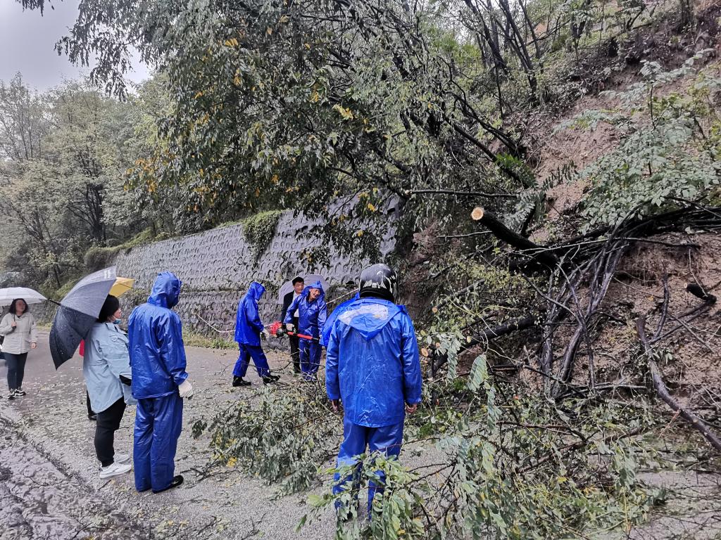 該中心負(fù)責(zé)人隨即組織搶險(xiǎn)救災(zāi)隊(duì)員12人冒雨趕赴現(xiàn)場,在確?,F(xiàn)場安全的前提下,開始了道路清障。首先,安排人員在兩側(cè)彎道向上50米處,設(shè)置路障、警示牌,提醒車輛減速停車等待,消除駕駛員擔(dān)憂。在查看檔護(hù)及樹木傾倒的情況后,將現(xiàn)場人員分為兩組,一組人員用油鋸對(duì)橫擋在路中央的4棵樹木,采取分段移除的方式清理,另一組人員用鐵銑對(duì)路面的淤泥進(jìn)行清理,豆大的雨滴和汗水很快打濕了搶險(xiǎn)隊(duì)員的臉頰,終于在9時(shí)40分搶通了道路,保障了車輛的安全通行。一旁的卡車司機(jī)豎起大拇指高呼道“關(guān)鍵的時(shí)候,還是要看咱焦坪社區(qū)的人!謝謝你們了!”