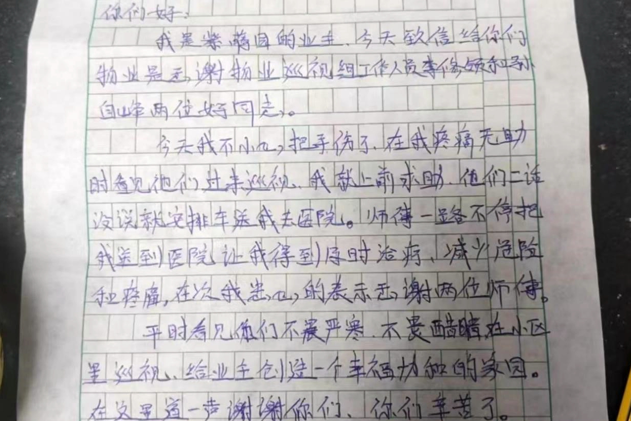 在網絡發(fā)達的當今社會,信件早已經淡出了人們的視線,尤其是手寫的書信,更是彌足珍貴。 然而近日銅煤繡園管理中心卻收到了一位業(yè)主手寫的感謝信。信中寫到:“感謝秩序部人員的熱心幫助!你們就像一面鏡子,映照出銅煤物業(yè)的規(guī)范管理和這些工作人員高尚無私的優(yōu)秀品質。”娟秀的字跡一筆一劃都是業(yè)主發(fā)自內心對他們工作的認可和肯定。