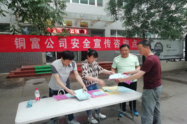 6月16日,銅富公司按照“安全生產(chǎn)月”活動(dòng)整體安排,在飛龍小區(qū)開展 “安全生產(chǎn)宣傳咨詢?nèi)铡被顒?dòng)。細(xì)雨蒙蒙,面向職工家屬宣傳安全生產(chǎn)政策法規(guī)、普及安全常識(shí)、應(yīng)急處置、自救互救、環(huán)保等知識(shí),吸引了廣大職工居民前來咨詢。