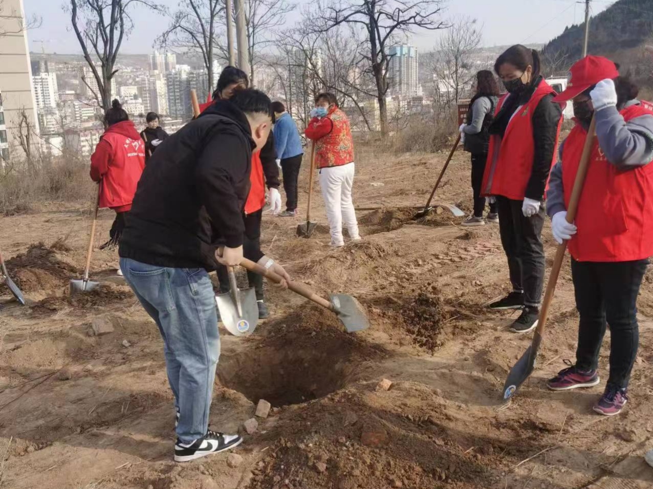 活動現(xiàn)場,大家揮鍬鏟土、默契配合,將一棵棵樹苗穩(wěn)穩(wěn)地扎根在土壤中,經(jīng)過近一個多小時的共同努力,樹苗便 “亭亭玉立”在沃土上。雖然大家腳底全是泥土,但眼前這一片新生的春意讓大家滿心歡喜。