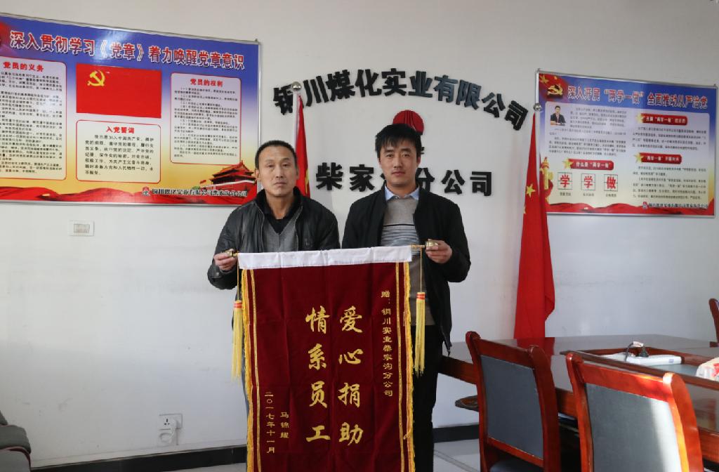 2017年12月7日,銅川實業(yè)柴家溝分公司職工馬錦耀將一面印有“愛心捐款,情系員工”的錦旗送到了柴家溝分公司,以此感謝分公司全體人員多次給予家庭的關(guān)心和幫助。