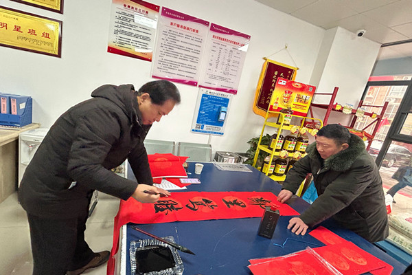 活動現(xiàn)場氛圍濃厚,春聯(lián)紙、毛筆和硯臺被整齊地擺放在桌子上,書法老師們揮毫潑墨,凝神貫注,風格不同書體盡顯神韻。一副副洋溢著節(jié)日喜慶和小區(qū)特色的春聯(lián)就寫好了,捧著稱心滿意的春聯(lián),居民們連聲道謝。