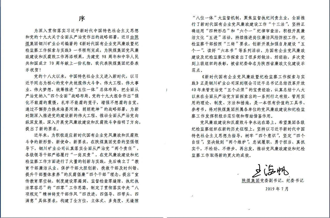 近日,由公司紀(jì)委編印的《新時(shí)代國(guó)有企業(yè)黨風(fēng)廉政暨紀(jì)檢監(jiān)察工作探索與實(shí)踐》一書(shū)順利完成,為陜煤集團(tuán)黨風(fēng)廉政建設(shè)和反腐敗工作再添碩果。