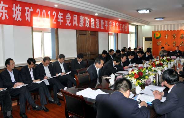 3月29日,東坡礦召開2012年度黨風(fēng)廉政建設(shè)暨平安穩(wěn)定工作會。該礦黨政主要領(lǐng)導(dǎo)、機關(guān)副科級以上干部、基層各單位主管、書記共計70余人參加了會議。會議由東坡礦副礦長兼總工程師龔永安主持。
