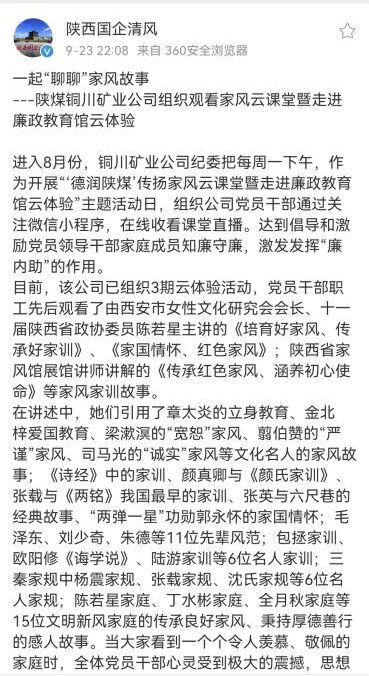 目前,該公司已組織3期云體驗活動,黨員干部職工先后觀看了由西安市女性文化研究會會長、十一屆陜西省政協(xié)委員陳若星主講的《培育好家風、傳承好家訓》、《家國情懷、紅色家風》;陜西省家風館展館講師講解的《傳承紅色家風、涵養(yǎng)初心使命》等家風家訓故事。