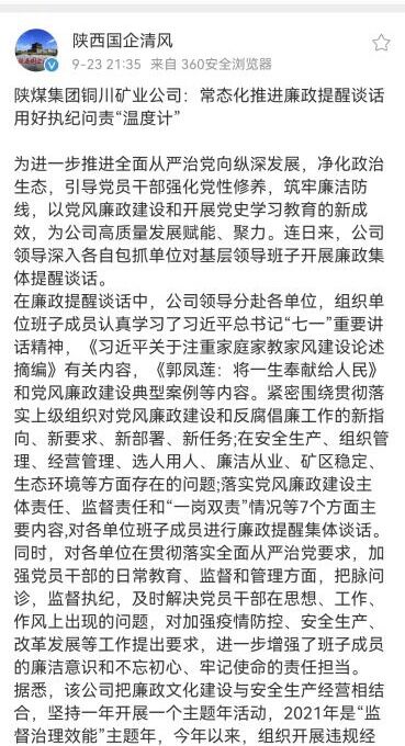在廉政提醒談話中,公司領(lǐng)導(dǎo)分赴各單位組織單位班子成員認(rèn)真學(xué)習(xí)了習(xí)近平總書記“七一”重要講話精神,《習(xí)近平關(guān)于注重家庭家教家風(fēng)建設(shè)論述摘編》有關(guān)內(nèi)容,《郭鳳蓮:將一生奉獻(xiàn)給人民》和黨風(fēng)廉政建設(shè)典型案例等內(nèi)容,并緊密圍繞貫徹落實(shí)上級(jí)組織對(duì)黨風(fēng)廉政建設(shè)和反腐倡廉工作的新指向、新要求、新部署、新任務(wù);在安全生產(chǎn)、組織管理、經(jīng)營管理、選人用人、廉潔從業(yè)、礦區(qū)穩(wěn)定、生態(tài)環(huán)境等方面存在的問題;落實(shí)黨風(fēng)廉政建設(shè)主體責(zé)任、監(jiān)督責(zé)任和“一崗雙責(zé)”情況等7個(gè)方面主要內(nèi)容,對(duì)各單位班子成員進(jìn)行廉政提醒集體談話。同時(shí),對(duì)各單位在貫徹落實(shí)全面從嚴(yán)治黨要求,加強(qiáng)黨員、干部的日常教育、監(jiān)督和管理方面,把脈問診,監(jiān)督執(zhí)紀(jì),及時(shí)解決黨員干部在思想、工作、作風(fēng)上出現(xiàn)的問題,對(duì)加強(qiáng)疫情防控、安全生產(chǎn)、改革發(fā)展等工作提出要求,進(jìn)一步增強(qiáng)了班子成員的廉潔意識(shí)和不忘初心、牢記使命的責(zé)任擔(dān)當(dāng)。