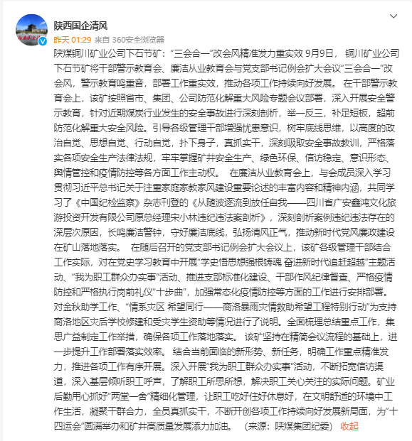 9月9日, 銅川礦業(yè)公司下石節(jié)礦將干部警示教育會、廉潔從業(yè)教育會與黨支部書記例會擴大會議“三會合一”改會風,警示教育鳴重音,部署工作重實效,推動各項工作持續(xù)向好發(fā)展。該礦領導、機關(guān)科部長、基層主要領導參加會議。