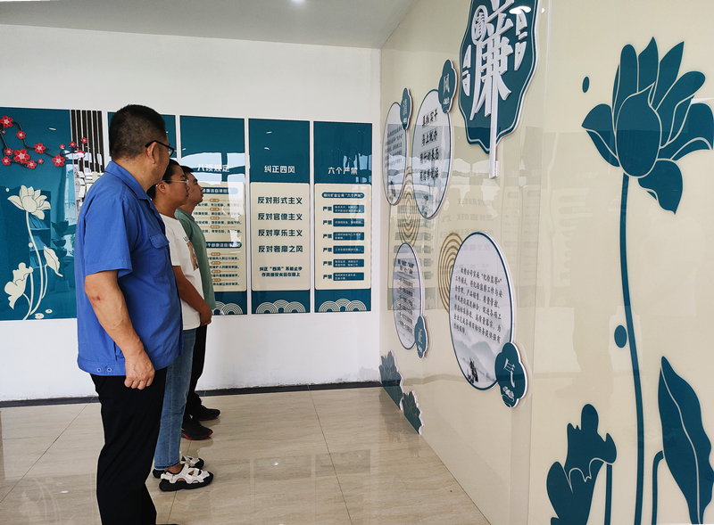 沿著長廊繼續(xù)往里走,一幅幅包含“自律準(zhǔn)則、八項(xiàng)規(guī)定、糾正四風(fēng)、六個嚴(yán)禁”的清正廉潔牌板,美觀清新的“青蓮”圖案設(shè)計(jì),簡約凝練的“清風(fēng)正氣”文字渲染,猶如美麗的畫卷徐徐展開,吸引著干部職工駐足觀看,使廉政文化入眼、入腦、入心,從而達(dá)到潛移默化、潤物無聲的思想滲透,筑牢“不敢腐、不能腐、不想腐”的廉潔“防火墻”。