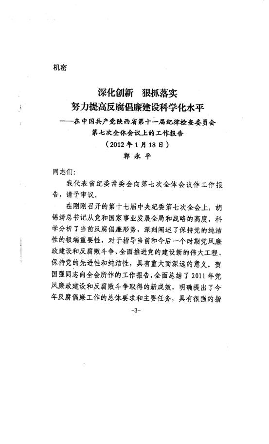 中共陜西陜煤銅川礦業(yè)有限公司紀律檢查委員會轉(zhuǎn)發(fā)省郭永平同志在陜西省十一屆紀律檢查委員會第七次全會上的工作報告