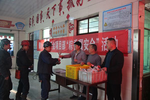 “劉師傅!辛苦了!今天是端午節(jié),粽子和雞蛋送給你。班中注意安全,實現(xiàn)安全生產(chǎn)!”6月7日, 照金項目部“粽香囑安全”活動分為三個班在照金項目部井口進行,為即將下井的一線員工送去了端午節(jié)和親人們深深的安全祝福。