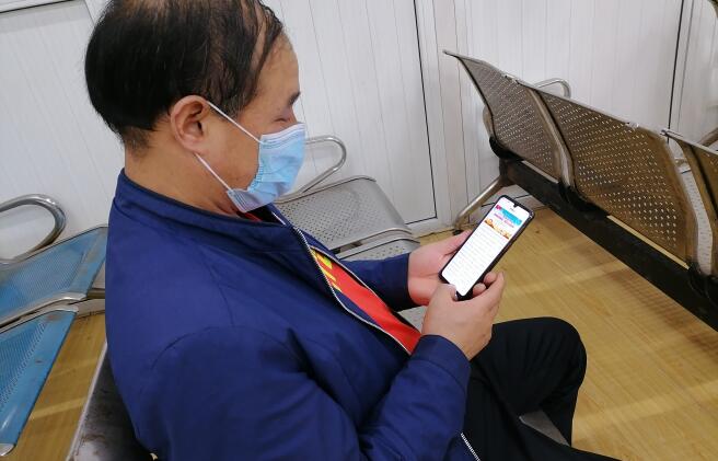 在項(xiàng)目部綜掘一隊(duì)下午班前會(huì)召開(kāi)之前,職工趙文紅正在通過(guò)手機(jī)微信閱讀掘進(jìn)施工安全技術(shù)知識(shí)要點(diǎn)。