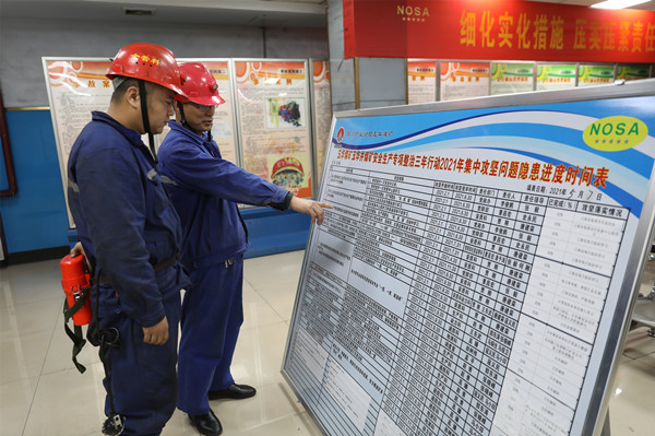 掛圖作戰(zhàn)加強(qiáng)集中攻堅(jiān)。按照2021年集中攻堅(jiān)問題隱患和制度措施“兩個(gè)清單”內(nèi)容,將各專業(yè)問題隱患形成清單和圖表。采用掛圖公示清單、掛圖分析分解的方式,每月組織召開一次安全專項(xiàng)整治三年行動(dòng)集中攻堅(jiān)推進(jìn)會(huì),研究解決集中攻堅(jiān)工作中存在的問題,制定針對(duì)性措施。每周安全辦公會(huì)通報(bào)攻堅(jiān)進(jìn)度,協(xié)調(diào)隊(duì)伍部署階段任務(wù)。基層單位每天班前會(huì)通報(bào)任務(wù)進(jìn)度倒排工期,落實(shí)責(zé)任到人。整體工作按照天推進(jìn),周小結(jié),月匯總的機(jī)制,掛圖作戰(zhàn)、精準(zhǔn)施策、強(qiáng)化措施、緊盯現(xiàn)場,緊密結(jié)合安全生產(chǎn)月事故隱患大掃除、百日安全生產(chǎn)大行動(dòng),充分利用安全管理提升的窗口期,明確時(shí)間節(jié)點(diǎn)緊盯19項(xiàng)集中攻堅(jiān)任務(wù),狠抓“兩清單”落實(shí),聚焦重大風(fēng)險(xiǎn)防控,全力解決問題隱患,扎實(shí)推進(jìn)重點(diǎn)整治工作任務(wù),推動(dòng)礦井安全形勢持續(xù)穩(wěn)定向好。