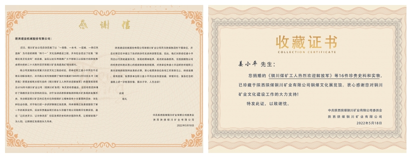 公司“四個(gè)一”銅煤特色文化品牌工程啟動(dòng)實(shí)施后,適時(shí)向社會(huì)發(fā)出了征集“銅煤紅色文化史料”的啟事,受到了陜西建設(shè)機(jī)械股份有限公司職工姜小平的高度關(guān)注,并積極主動(dòng)聯(lián)系公司黨委宣傳部,表達(dá)了無償捐贈(zèng)他所收集珍藏的與銅煤有關(guān)的16件珍貴藏品的意愿,希望“通過無償捐贈(zèng)讓與銅煤有關(guān)的文物,由散失在民間而找到歸屬、回到源頭,穿越歷史煙云、復(fù)活紅色記憶、重新煥發(fā)光彩,讓更多人了解銅煤的歷史與過往”。