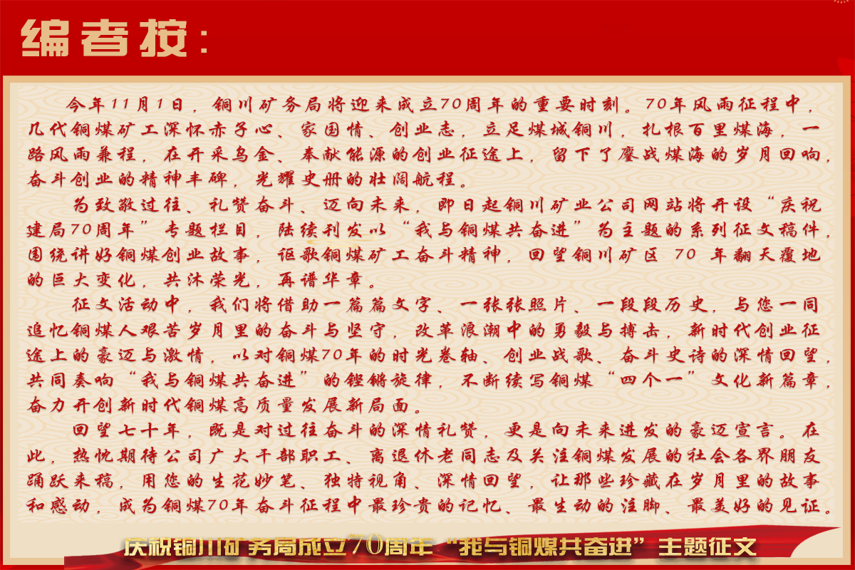 當(dāng)時(shí)光的年輪行進(jìn)到2025年,位于三秦大地、煤城銅川這方創(chuàng)業(yè)熱土上的銅川礦業(yè),也將迎來(lái)企業(yè)成立70周年的日子。在七秩春秋的奮斗中,幾代銅煤礦工把“能源報(bào)國(guó)、服務(wù)社會(huì)”的初心匯成礦區(qū)的光影記憶,把“開采烏金、奉獻(xiàn)光熱”的誓言鍛造成創(chuàng)業(yè)奮戰(zhàn)的鋼鐵脊梁,以一曲巍然挺立于渭北黑腰帶上的奮斗長(zhǎng)歌,講述著屬于銅煤人的創(chuàng)業(yè)故事和動(dòng)人史詩(shī)。