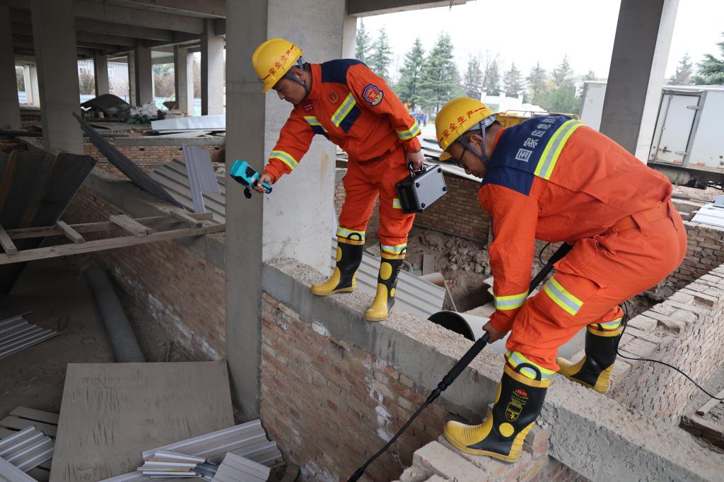 抵達現場后,救援人員迅速搭建帳篷,成立現場指揮部。探查搜救組第一時間沖入廢墟,利用熱成像儀對廢墟進行全域掃描,蛇眼探測儀深入縫隙,精準定位“被困人員”,一人深陷坍塌基坑,被垮塌構件埋壓,另一人困于倒塌樓層的上方平臺,無法自行脫身。